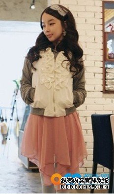 设计别致的荷叶边棒球服混搭不规则下摆的粉色雪纺裙,棒球服也可以混搭出优雅范儿。